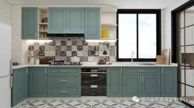 厨房,吊柜下方的增设的灯管可以让人在烹饪时,可以清晰的看清食物,清爽的海水蓝色系橱柜搭配水磨石墙面,还让人眼前一亮。