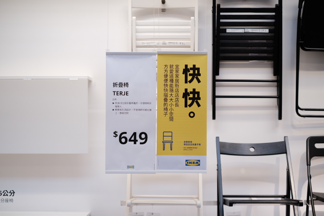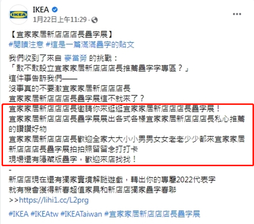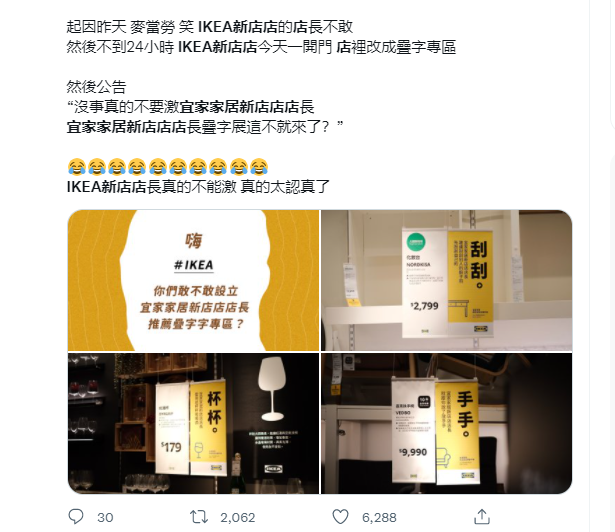 仅在被喊话的第二天,十几张叠字海报就被挂在了门店里。当天去购物的网友都笑了:“宜家这人真不能激,太认真了哈哈哈哈!”