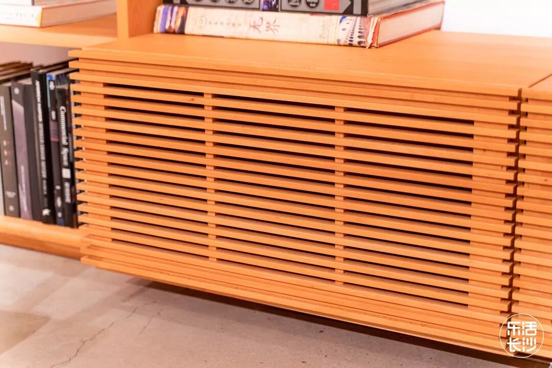 打开左右柜子的栅栏格,还可将音响设备放在这里,可以保证音响效果哦!