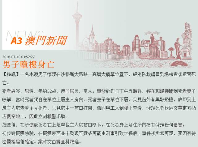 根据澳门日报的消息,下午大概17点的时候,事主还待在房间上层的主人房,事主老婆则待在房间的下层。突然,其老婆看到窗外有黑影闪过,感觉不妙,赶紧到上层去查看,结果看到窗户打开,事主已经不在。