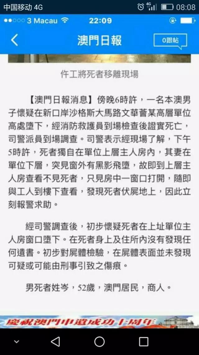 死者姓岑(52岁),本澳居民,商人。惟根据可靠消息透露,死者1979年从顺德移民来澳后,一直关心家乡经济发展,曾近斥巨资兴建大型商场。