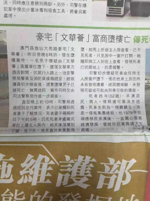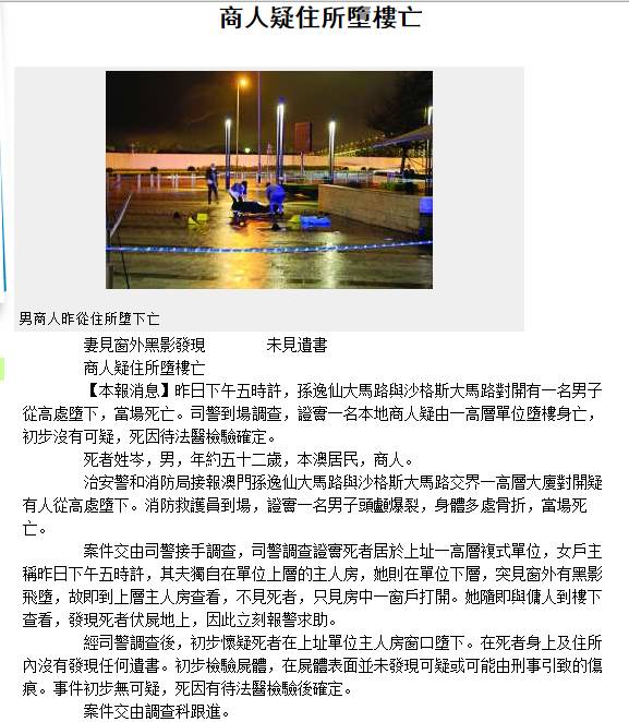 “司警初步怀疑死者由住所主人房窗户堕下,在他身上及住所未有发现遗书,经尸体检验,未发现可疑或可能由刑事引致的伤痕。