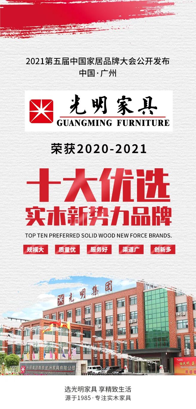 2021第五届中国家居品牌大会公开发布的“2020-2021十大优选实木新势力品牌”,代表着各个实木家具集散地的优秀品牌。其中,光明家具代表着东北实木家具的品质。