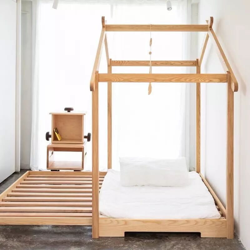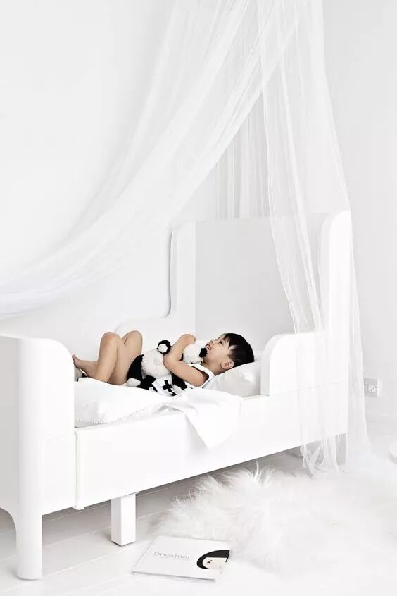 不少家长也喜欢给小朋友买这样的床架,一来高度低矮,分床睡后不用担心掉床;二来颜值高,上面挂上窗幔和串灯真的浪漫极了。