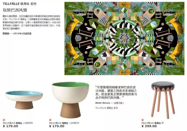 5限量版与时尚紧密结合,使宜家始终年轻。每逢节假日或与设计师合作,宜家都会推出限量版或特别版。今年2月开始的春季限量版缇弗拉系列,主打巴西风情,当然,装饰品较多,作为家具的可以选择茶几或储物柜。设计新潮,但价格较平常款略贵。