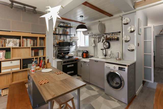 但无论如何腾挪转移,这个面积不足4㎡没有吊柜的厨房确实不能满足收纳需求,为此屋主另设了两个厨房分会场,往下看吧!