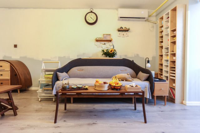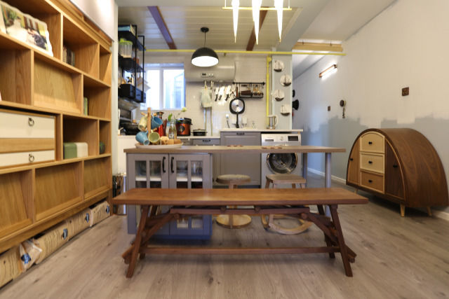 长条板凳来自时作,是由夫妇两人一块组建拼成的。