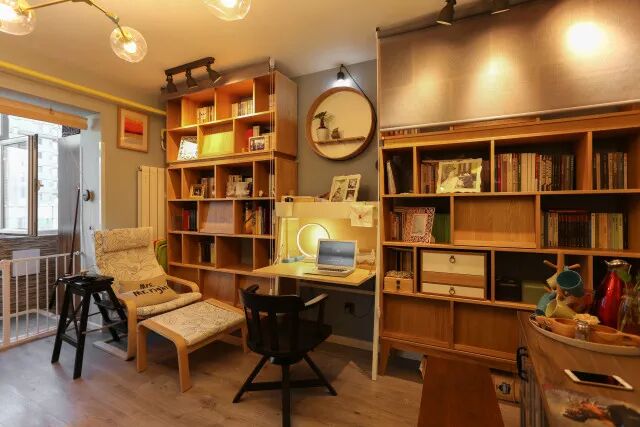 客厅西墙用两组书柜+书桌+宜家波昂休闲椅打造出一片办公休闲区。