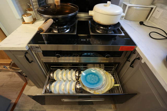▲集成灶下面是消毒柜,餐具是女主亲妈从景德镇买回来的,代表的是父母的审美水准,你们懂的。