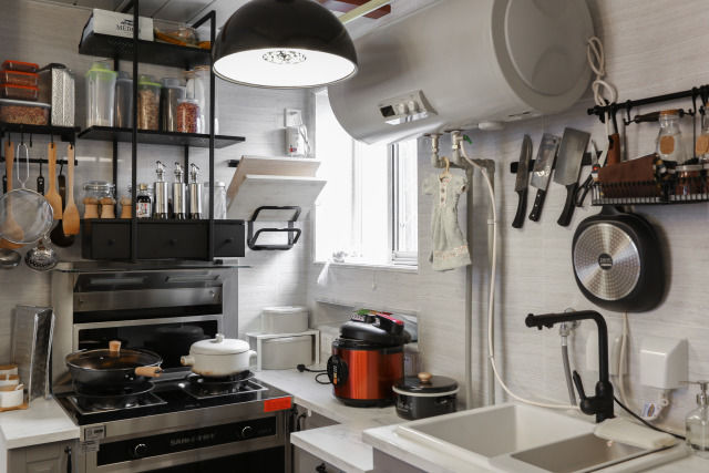 厨房墙面基本被热水器占了,且厨房上部有暖气管道,会影响吊柜寿命,宜家也不对吊柜质保,屋主就干脆放弃柜子,改为用开放置物架收纳,只放常用常擦拭的物品,不用担心落灰的问题。