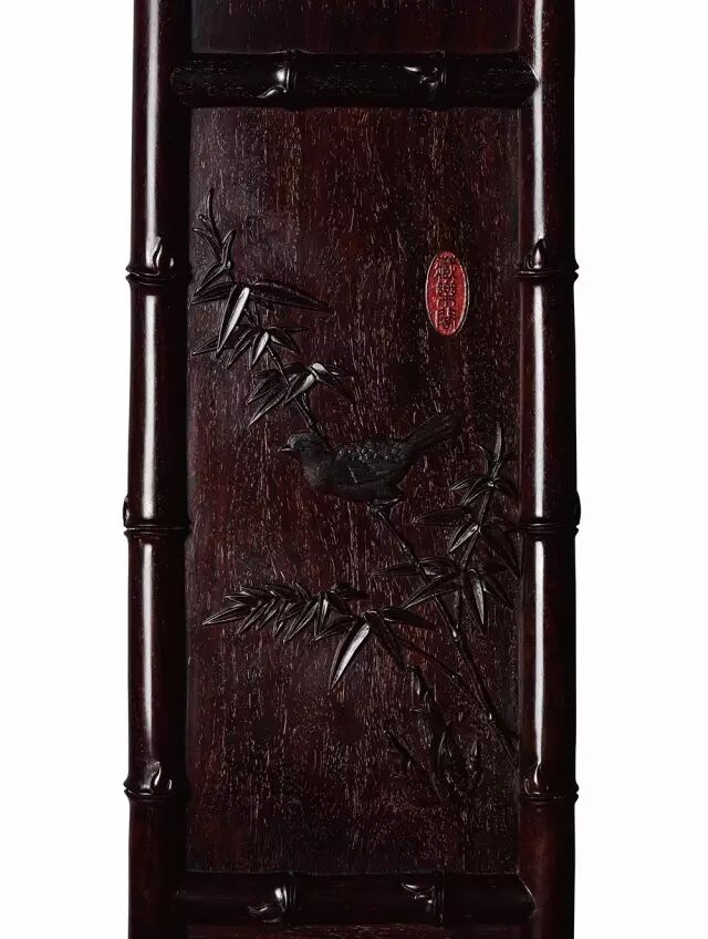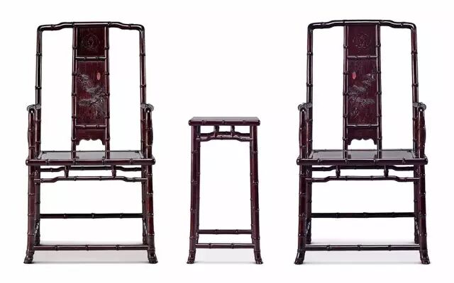 此对椅采用优质小叶紫檀制,色泽沉穆有光泽,通体满雕惟妙惟肖的竹节纹,自然生动。靠背三攒式,上截铲地浮雕如意云头纹开光;中截精雕竹叶、寒雀,动静相宜,营造出诗书画印一体的花鸟画面;下截锼出壶门亮脚,沿边起阳线。三弯扶手亦精雕竹节纹。扶手处与后腿竹干交圈,形成优美曲线。座面为硬屉,采用落堂起鼓做法。椅盘下安罗锅枨加双矮老,四足至底外撇,着地有力。整器榫卯严实,张弛有度。几亦为小叶紫檀制,几面攒框装板,边抹素混面并雕刻竹节。