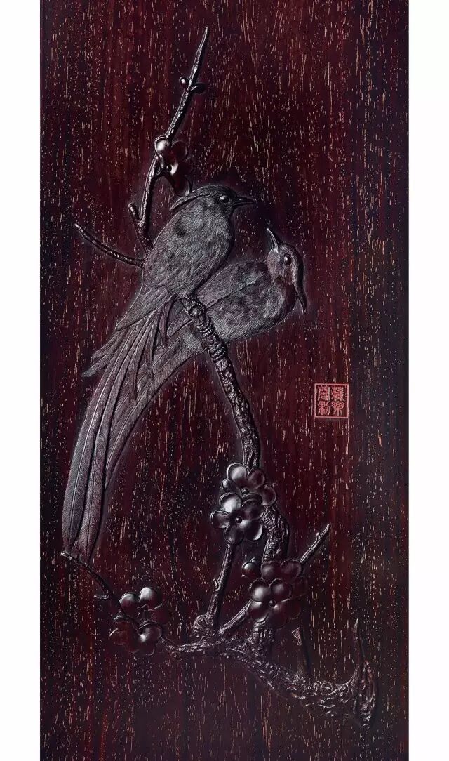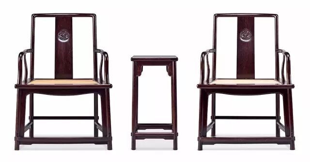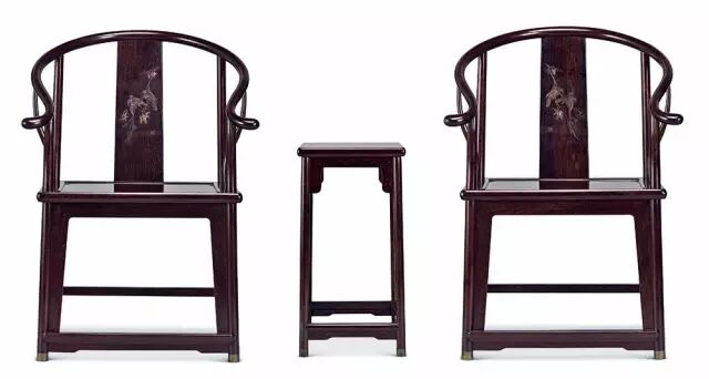 此套圈椅通体用料为小叶紫檀料。造型风格清新淡雅、单纯简练、清秀空灵、比例严苛标准,圈椅的细部构造没有繁复的装饰,背板处镶嵌黄花梨手工丝翎檀雕花鸟雕刻是点睛之笔。丝翎檀雕工艺独特之处在于每一片羽毛,需用一支不足半毫米的小三棱刀运刀几十甚至上百次,每刀的距离要一致。不同的身体区域,不同视觉角度的羽毛要用不同的三棱刀来刻画,利用材质特点和雕刻的深浅,产生不同的肌理效果和光影层次感。此套圈椅主要以线条为主,整体与局部的比例关系、细部装饰与整体风格的统一,都及其匀称而自然和谐。