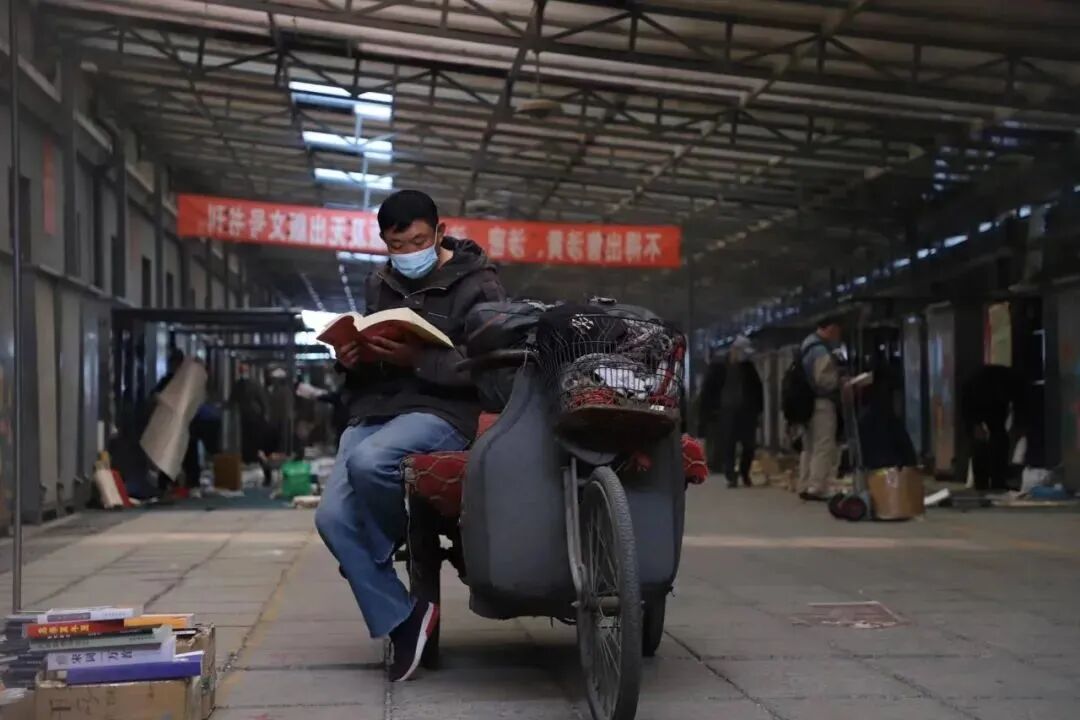 ▲休市之前的潘家园书市上,一个摊贩坐在三轮车上阅读。受访者供图