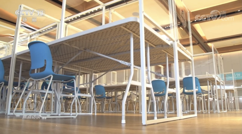 运动员餐厅的折叠条桌,在保证E字形落地防疫隔板不变的情况下,餐桌设计充分考虑到“两个奥运”的通用性——即能够在冬奥会结束后快速转化成为冬残奥会中适合轮椅运动员使用的餐桌,又能够降低成本、节俭环保。餐桌的桌腿上都设置了一个小小的按钮,在转换中只需要按压,工作人员就可以调整桌面高度,整个过程轻松快速。