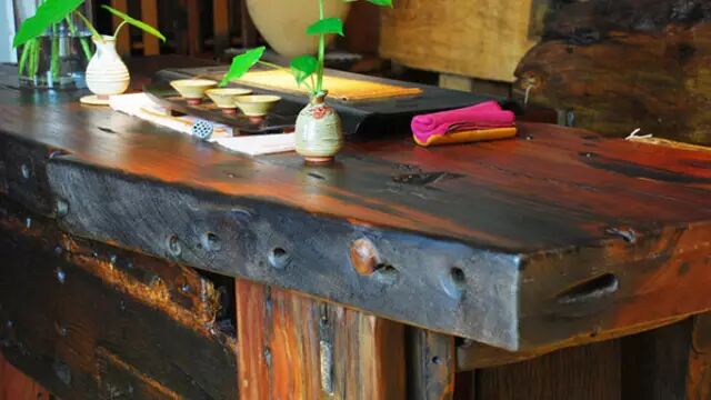 船/木餐台、酒柜、坐椅、案几,没有经过太复杂的设计,一件件具有艺术感与历史厚重感的家具就这样产生。它们全身布满了大大小小的孔洞,凹凸不平的表面,深深浅浅的颜色,但每一处的纹理都像在诉说着曾经的故事与沧桑,有观赏性与收藏意义。文末福利转发本条图文至朋友圈获得18个好友支持点赞即可获得,由一菩茶庄,提供的价值58元的茶食一份仅限到店自提名额有限,先到先得