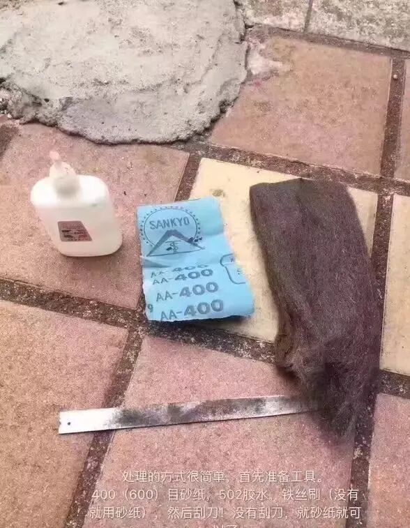 处理方式很简单。首先准备工具。400(600)目砂纸,502胶水,铁丝刷(没有就用砂纸),然后刮刀!没有刮刀,用砂纸也可以。