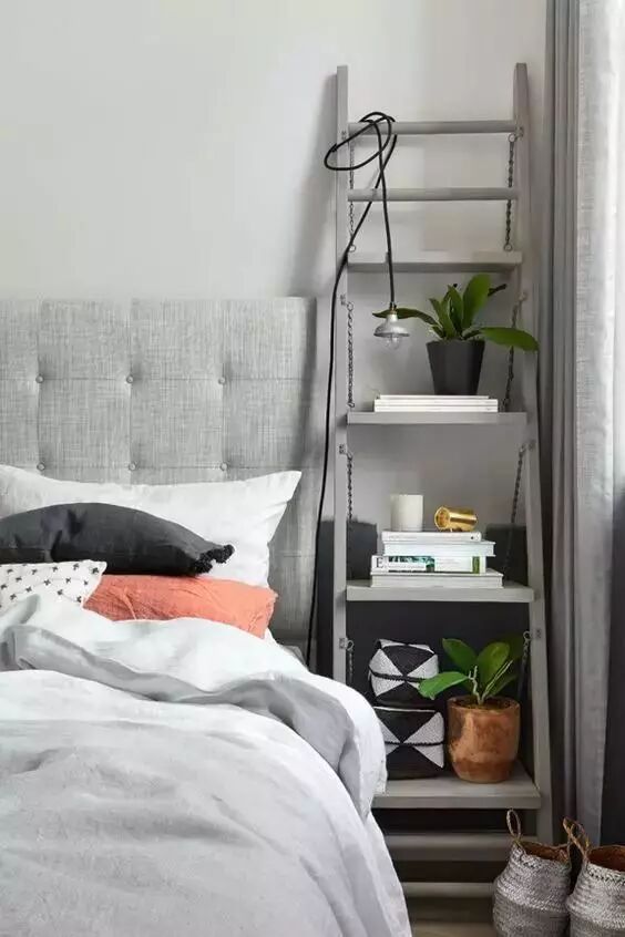 如果你的床头没有好的装饰想法,完全可以用小梯子来替代,充分利用家里的空间,完美收纳卧室物品