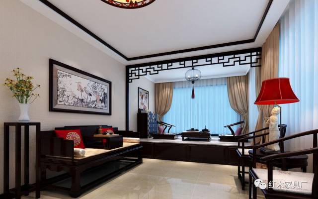 红木沙发在客厅中的重要地位,犹如国家的重要港口,必须能尽量多纳水,才可兴旺起来。优良的港口必定两旁有伸出的弯位,形如英文字母的"U"字。红木沙发的摆设亦应如先进的港湾一样,两旁各有一臂伸出为宜。倘若红木沙发是一排直过,那便犹如壮士断臂,难有作为。有些港口虽然缺了一臂,不能左右护持,但只要在去水之处有弯位兜抱逆水。别墅中式装修如果因环境所限,红木沙发不能左右有臂护持,那么可以退而求其次,在去水位摆设另一红木沙发,自制下关砂来迎纳从大门流进的来水,形成聚水之局,这也符合风水之道。有些住宅的大门与阳台的门成一对角线,那便更有需要在去水处摆设下关砂以应纳来水,以免从大门流进的水泄露无遗。