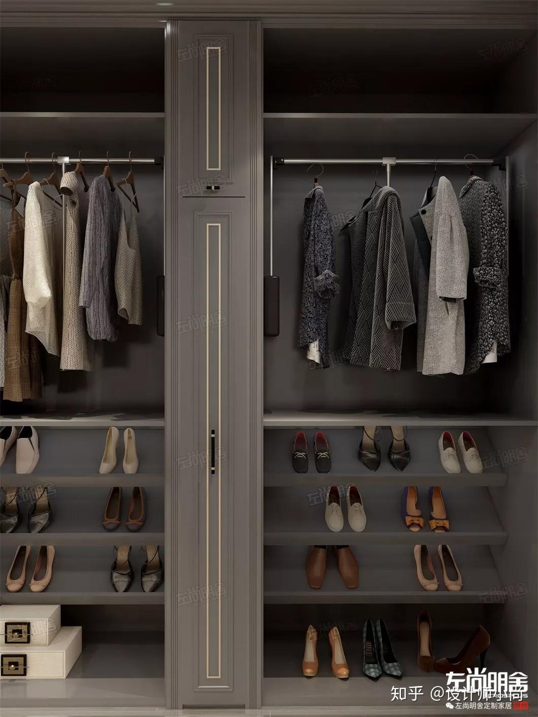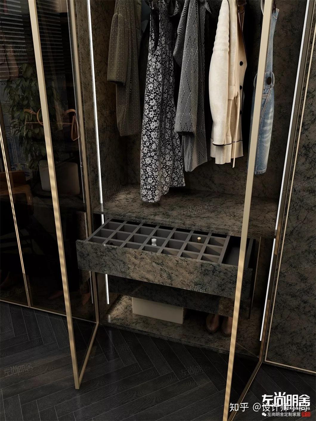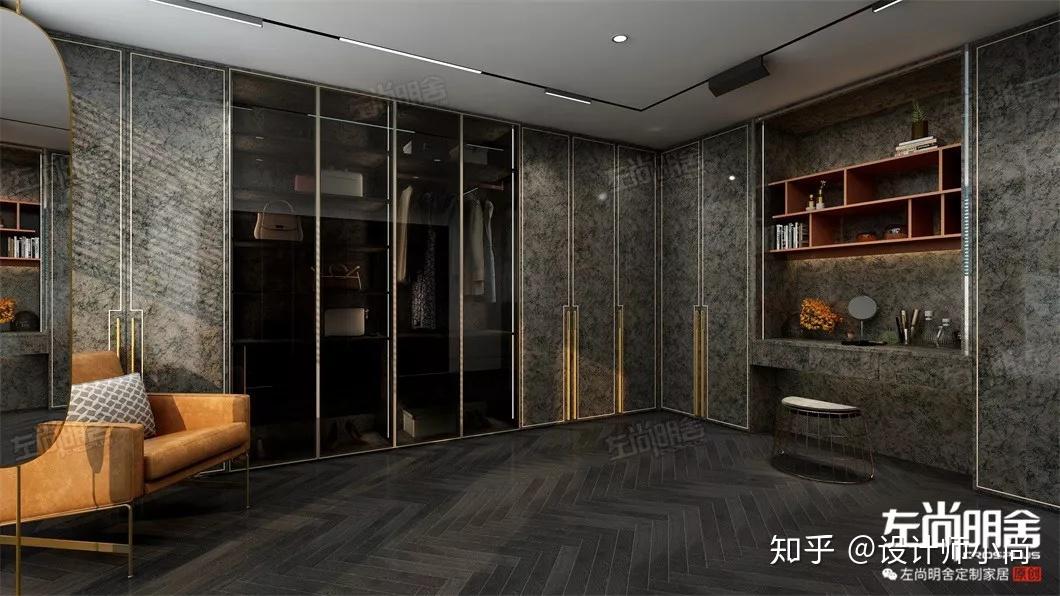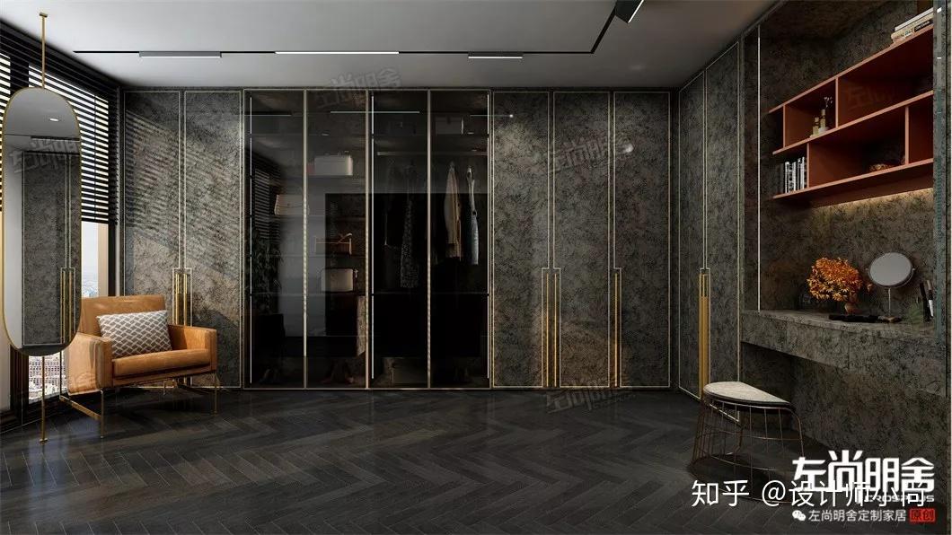 ▲崔:“衣帽间大面积高光石材感门板,嵌金属装饰条,与金色拉手相呼应。实物的精致工艺,就是轻奢最好的注脚。”