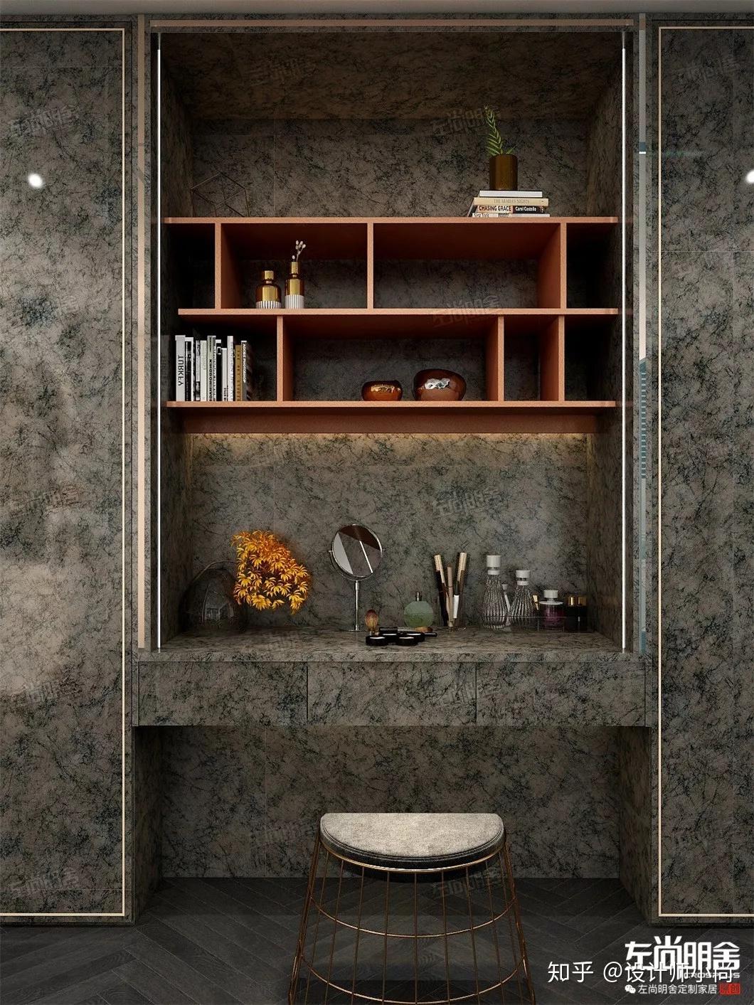 ▲施:“皮纹橙色梳妆台,围绕一圈玫瑰金金属条,奢华感扑面而来。梳妆台上下挡板隐藏式灯带的光与侧板竖状灯带相互交织,这就是C位。”