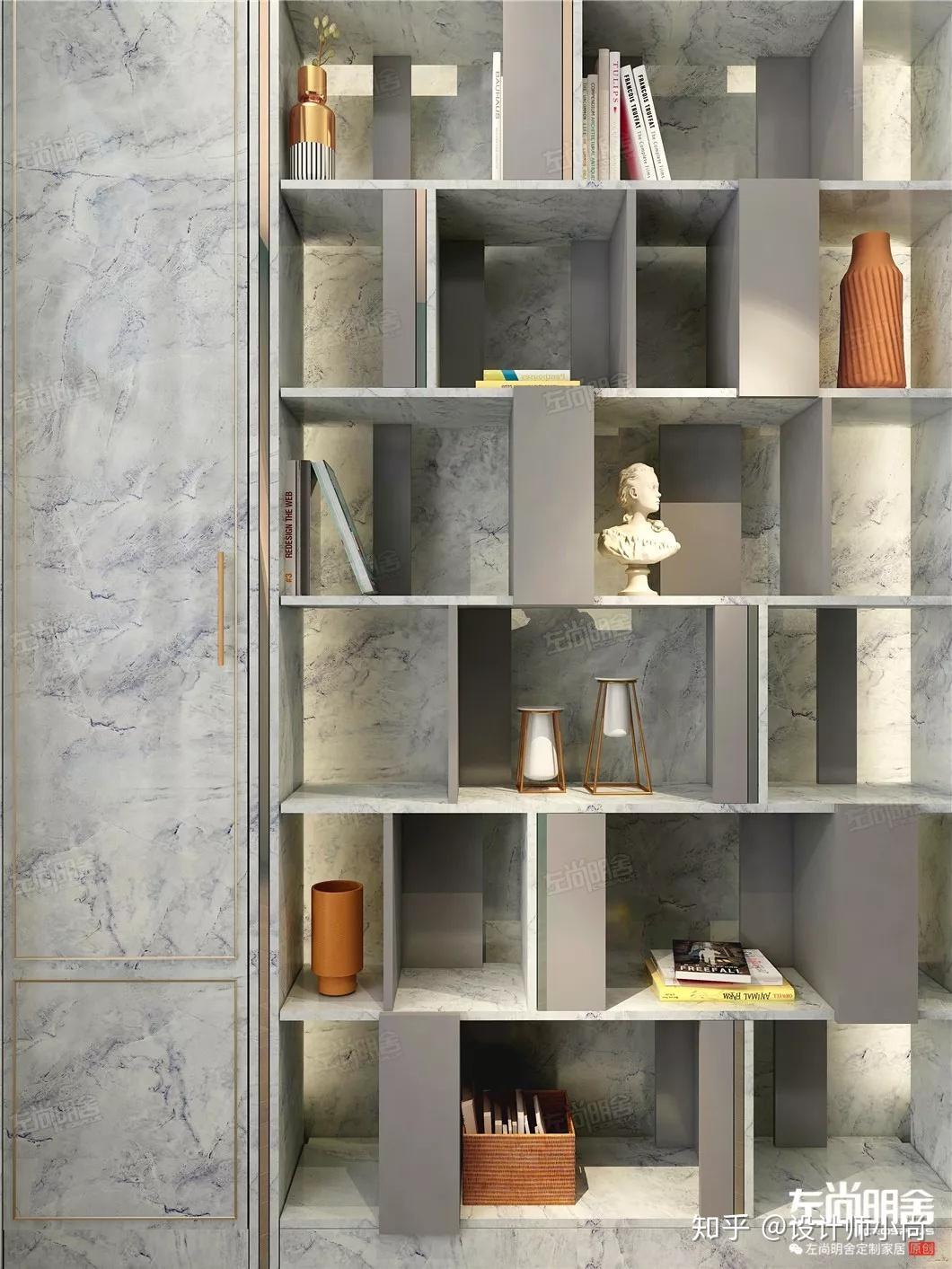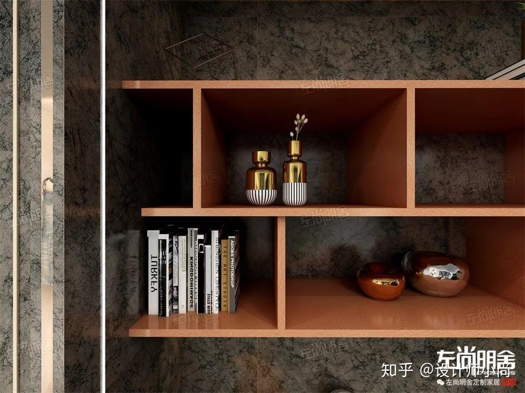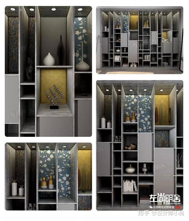 ▲张:“开放格,看似漫不经心,实则相同的结构做了多处造型上的呼应。背板的设计充分展现花色和工艺的多样化,板材和布艺软包的碰撞,冷暖色的碰撞,成为整个柜体的视觉焦点。”