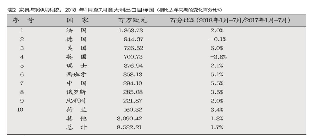 在2018年的前七个月,中国在意大利十大家具和照明出口目标国中排名第七。2018年1月至7月,增速有所放缓(+5.5%),但仍是前十国家和地区中增长最快的(表2)。