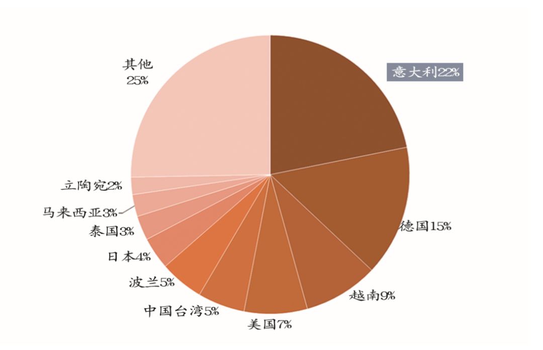 与竞争对手相比,意大利是家具销售额最高的国家和地区(2017年占中国进口总量的22%)。德国排名第二,占15%(图5)。