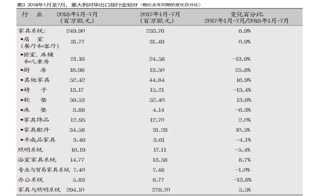在2018年的前七个月,意大利出口增长主要受到软垫(+13.6%)的推动,其次是其他家具(+16.9%)和家具配件(+10.5%)(表3)。