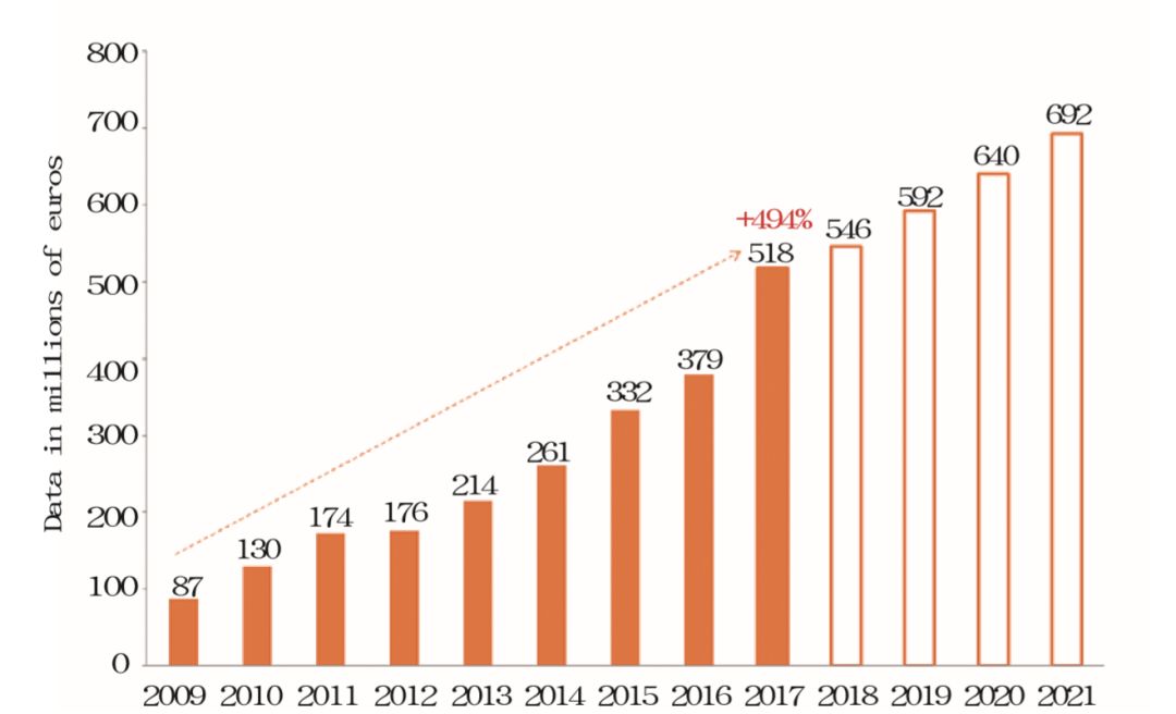 2009年起,意大利对中国的家具出口(家具和照明系统)稳定增长,2017年相比2009年增长了494%(图1)。
