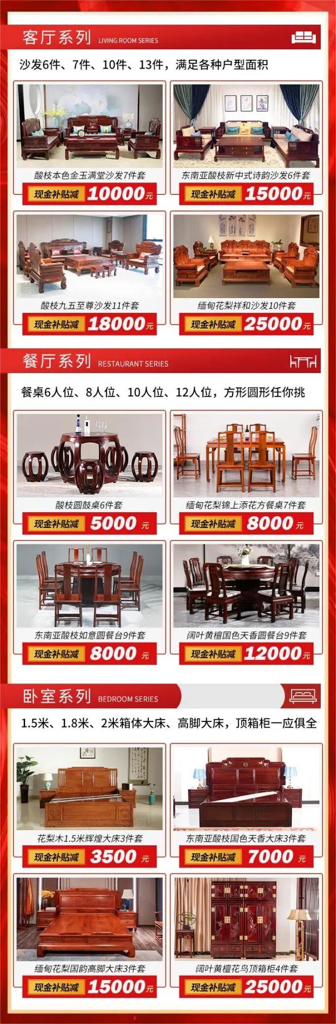展会现场还有多种材质、多种款式、不同价位的全房红木精品套餐,满足消费者的不同需求,高达5万元现金补贴!