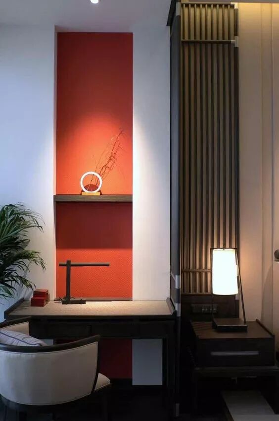 比如,凹进去的背景墙刷上朱红色,打上一盏射灯光束,随意地放上摆件树枝,意境显现。作为案几背景,还是明智之举。