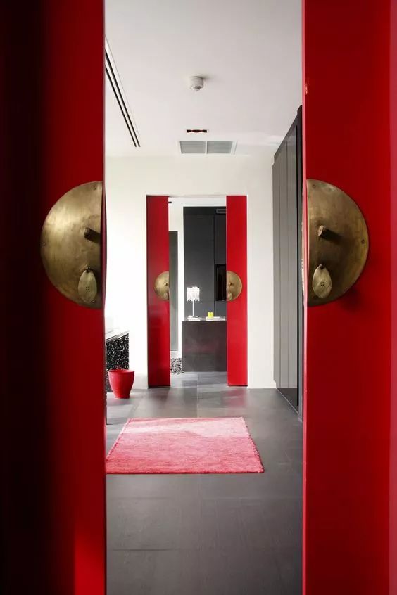 如果是别墅级别的房子,或者层高足够,这种红色大门还是颇为大气的选择。加上极具中国特色的黄铜把手,真有不少“绣帘时拂朱门锁”的意境。