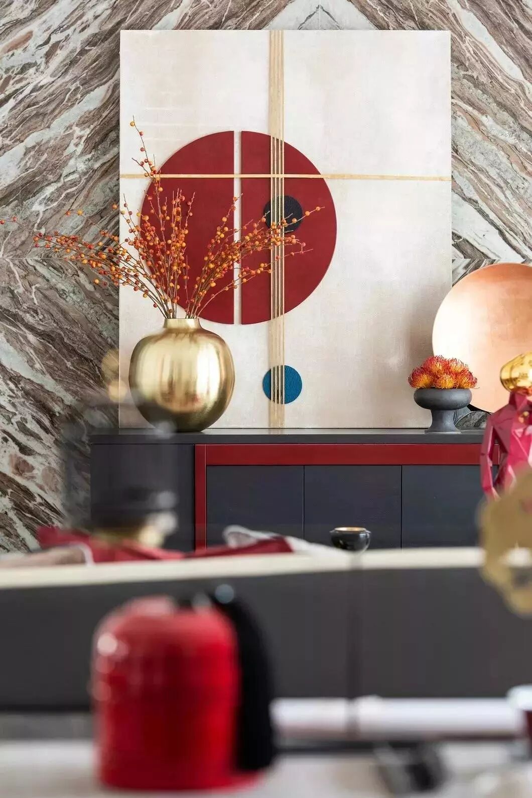 中式的斗柜,用上红色也是相当贵气,这种小面积的使用,能给原本已经用了沉闷老气颜色的家中带来些许活泼之意。