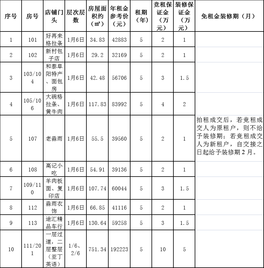 阜阳市土地利用开发公司所属颍东区北京路电信局东侧土地利用开发公司商办楼101、111/201商办楼5年期租赁权,按现状拍租。竞拍资格、范围、建筑面积、年租金参考价、竞拍保证金、整体和分拆拍租详情等见网站附件《交易文件》。