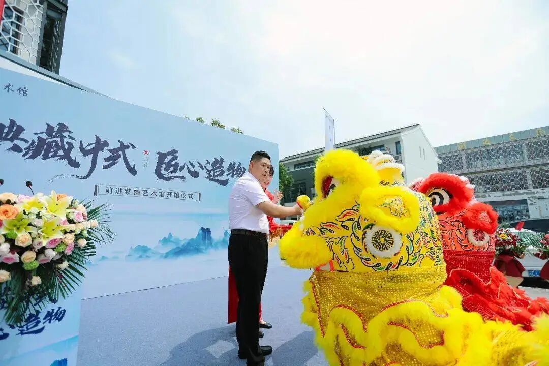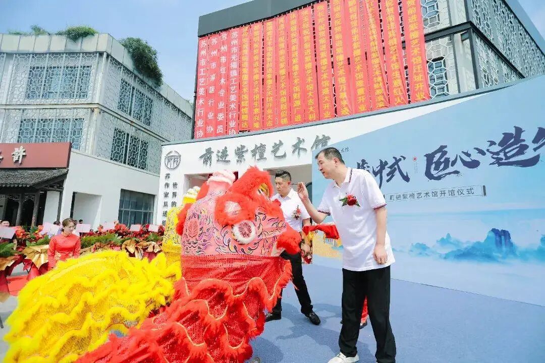 10:18,前进紫檀艺术馆开馆仪式正式开始。苏州市家居协会荣誉会长顾志浩和前进紫檀艺术馆创始人张守进为祥狮点睛,同时,还举行了开馆仪式。