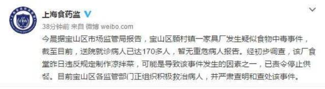 上海食药监局消息,宝山区顾村镇一家具厂发生疑似食物中毒事件,已有170多人送医院就诊,暂无重危病人报告。经初查,该厂食堂违反规定制作凉拌菜,或是中毒事件原因之一。