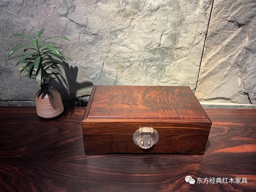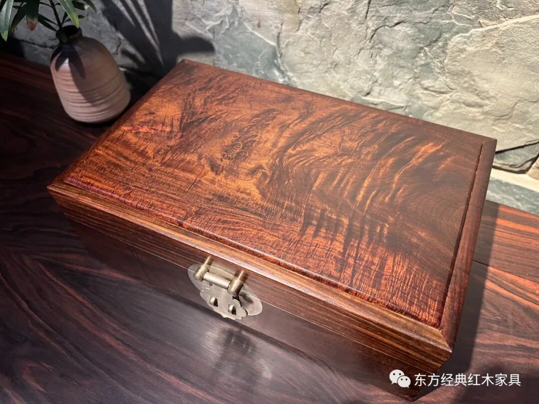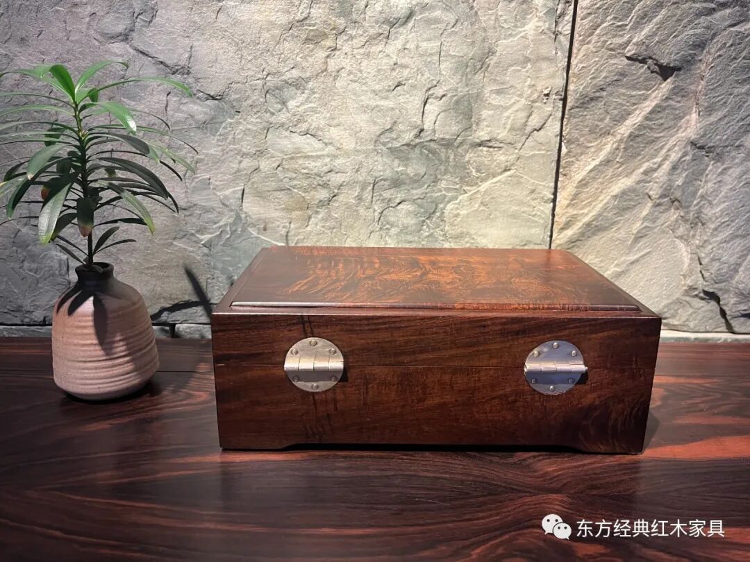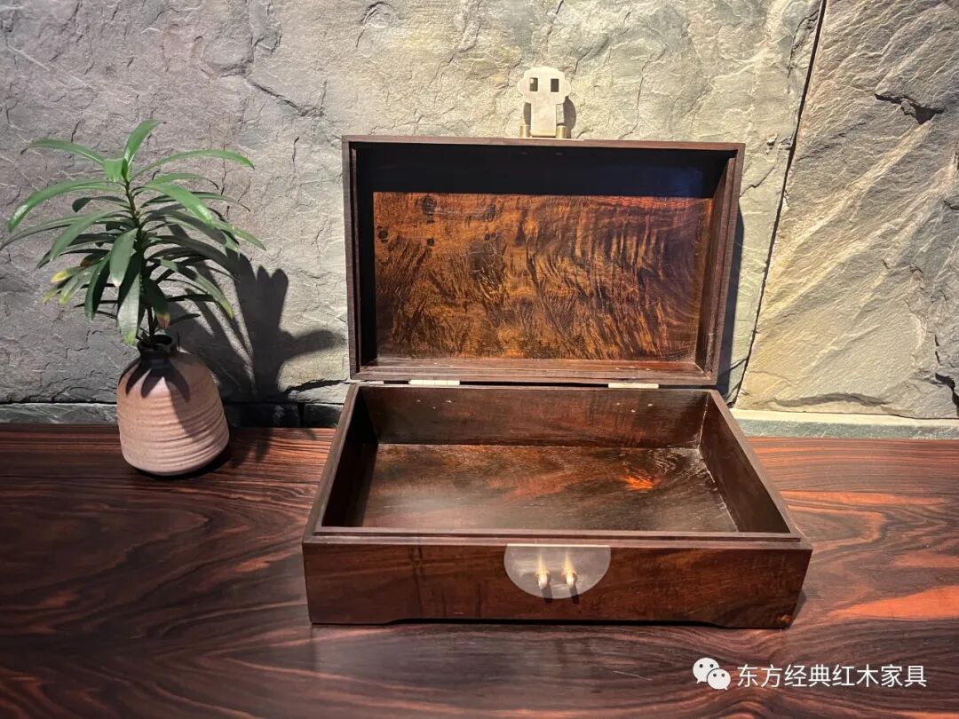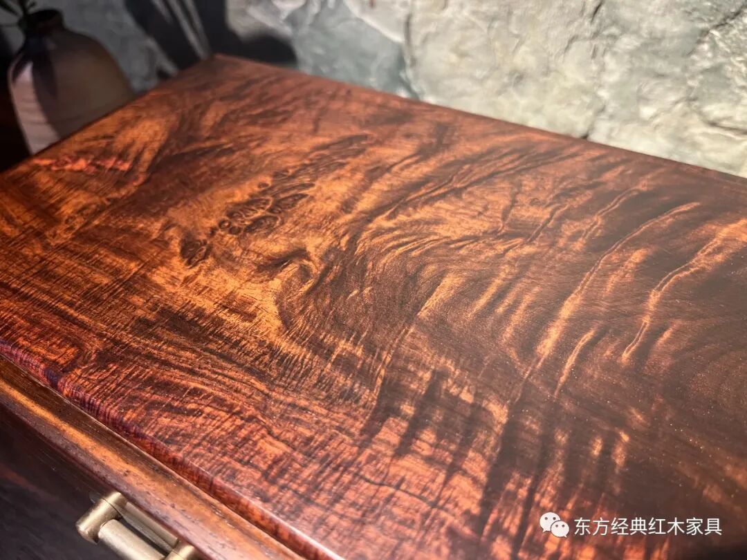 精选色深油足的交趾黄檀高山老料,一木开出、全为独板,并有美丽的瘿木纹和闪耀的水波纹。精致白铜配件,金木相映生辉。不上漆、不胶磨、不烫蜡,磨光后色泽亮丽、花纹悦目、质感超卓、包浆温润。