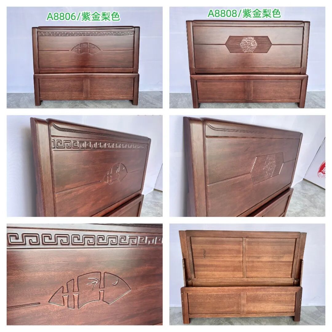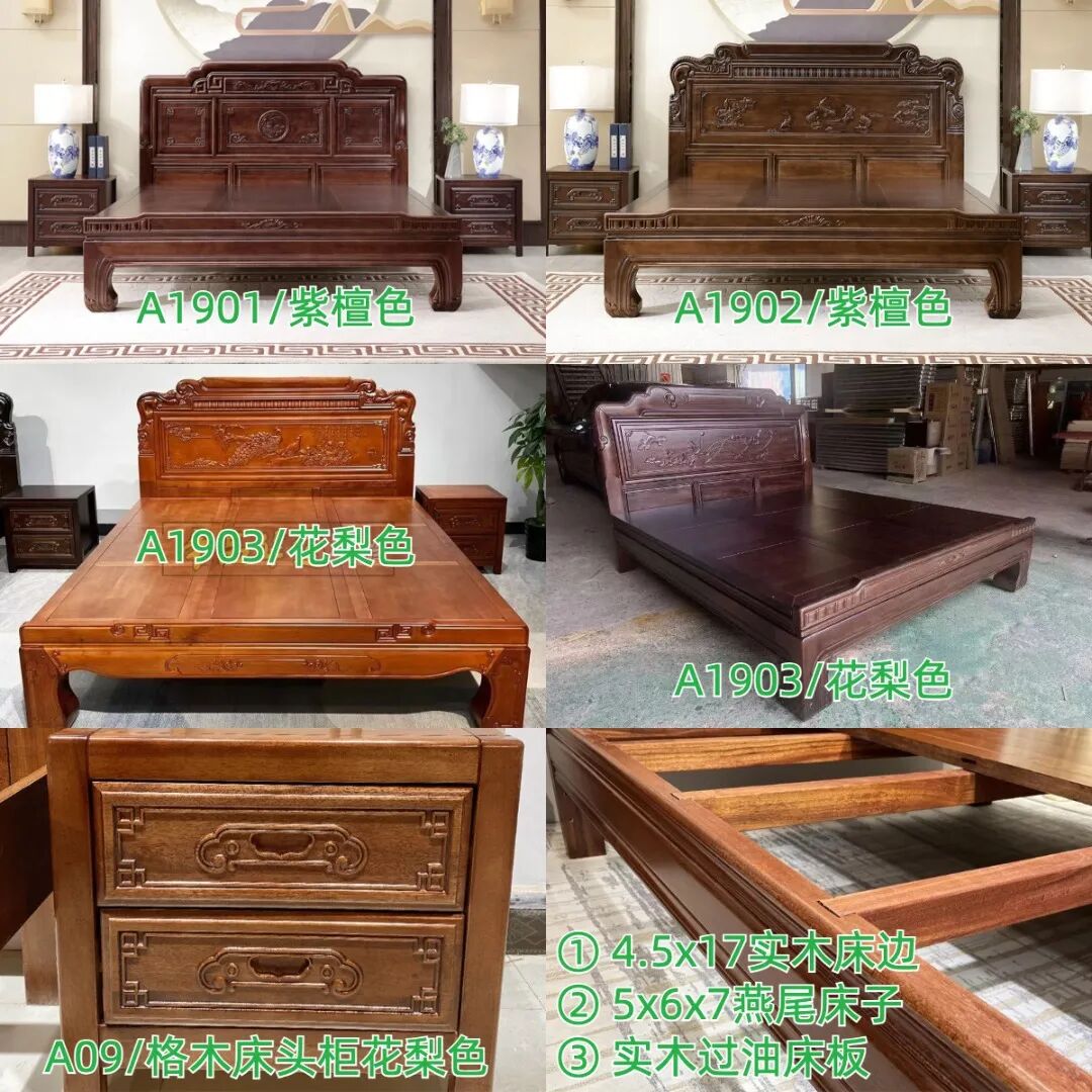 【价格】:批发价1650,会员价1599【规格】:1.8米,花梨色/紫檀色 【标配】:4.5x17实木床边,5x6x7卡槽床子 【选配】:实木床板340元,生态板床板260元,床头柜165元/个 【发货地】:江西南康【款式】:格木弯头复古雕花系列 【价格】:批发价1180,会员价1130 【规格】:1.8米/2米,花梨色 【标配】:月牙扣4.5x17实木床边,5x6x7卡槽床子 【选配】:油漆床板260元,床头柜165元/个,抽屉高箱600,气压高箱500,卡槽床边加50元 【发货地】:江西南康