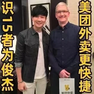 而针对林俊杰此次与美团合作购买iPhone新机,还有网友制作了一幅梗图。在图中,林俊杰和苹果CEO库克站在一起,而库克手中拿着一个美团外卖的袋子。图片两侧写着“识15者为俊杰,美团外卖更快捷”的字样,以此调侃二者的这一次合作。