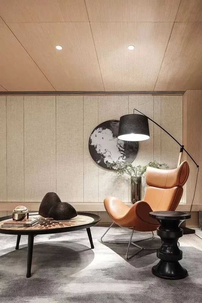新中式和日式傻傻分不清楚?新中式更讲究统一,护墙板和地板色调统一,并非日式多白墙。绒皮沙发和地毯让空间多了温暖。在这样的家里,静静享受休闲时光。