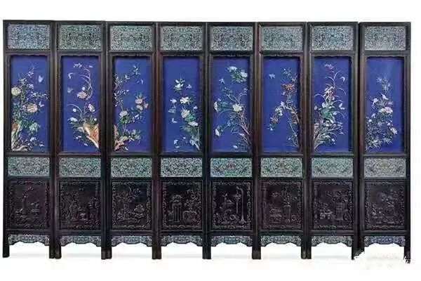 Top12清乾隆 御制紫檀掐丝珐琅蓝地百宝嵌四季花卉屏风。