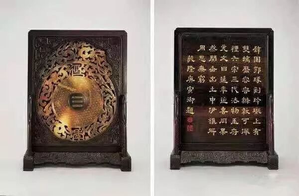 TOP8:清代御制紫檀木嵌“延年”龙凤纹古玉壁御题诗插屏。
