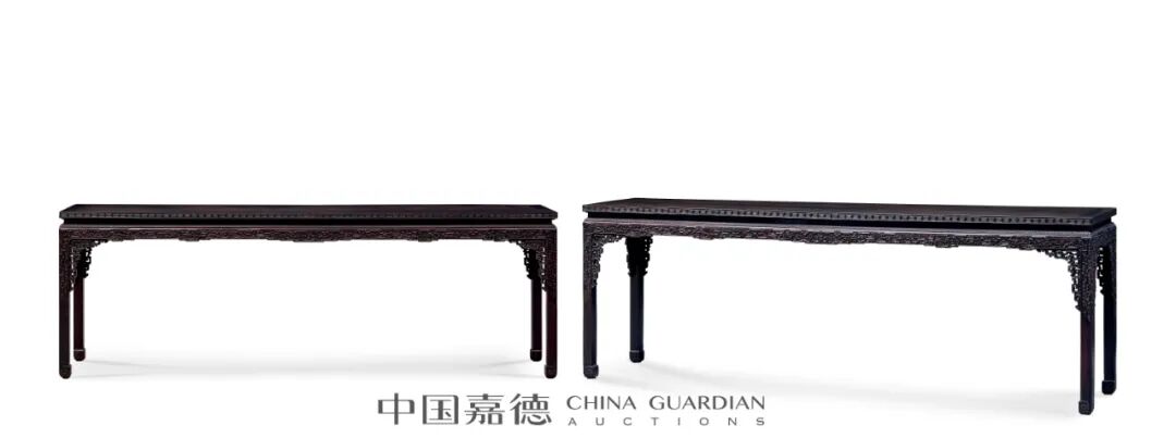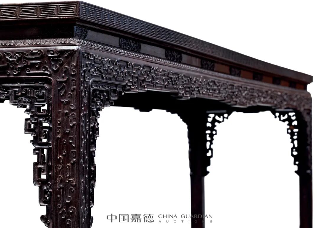 乾隆几乎将紫檀家具布置到所有自己能触及的地方,更是在皇宫内聚集了来自广州、苏州、扬州等地的能工巧匠,并亲自把关设计。紫檀家具的品类也涉及屏风、宝座、龙柜、大案、多宝格、桌、椅、挂屏、插屏以及小件陈设品等各类器物。清乾隆 御制紫檀雕兽面龙纹条桌成对