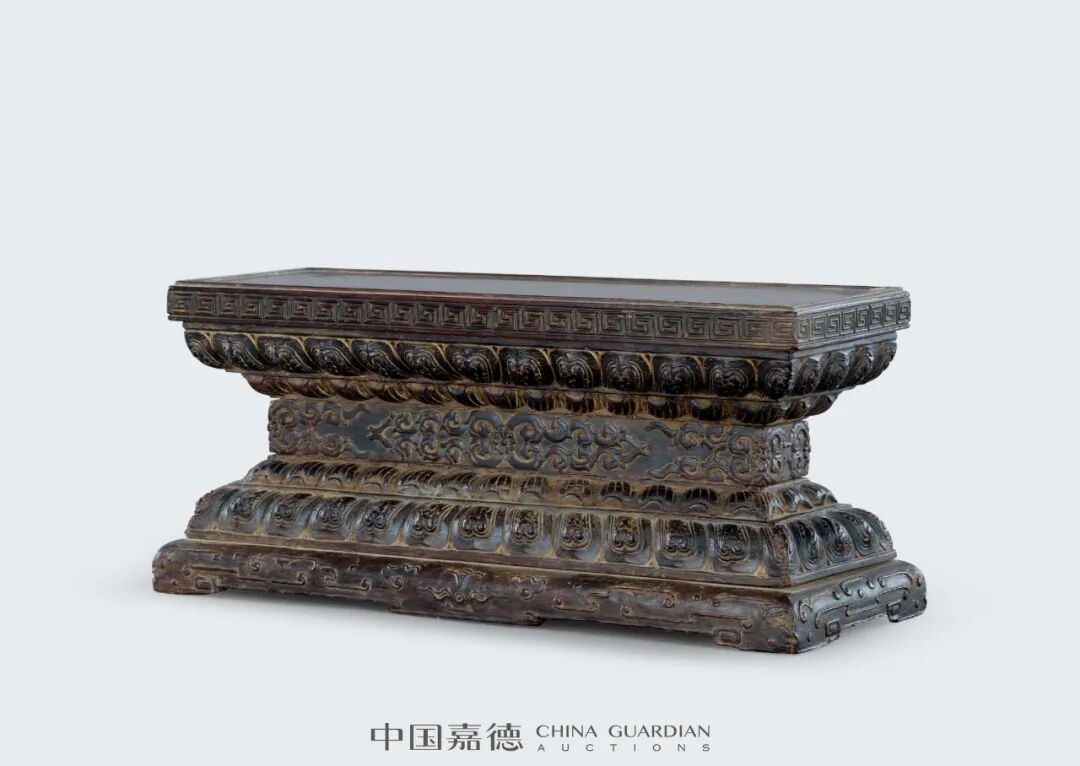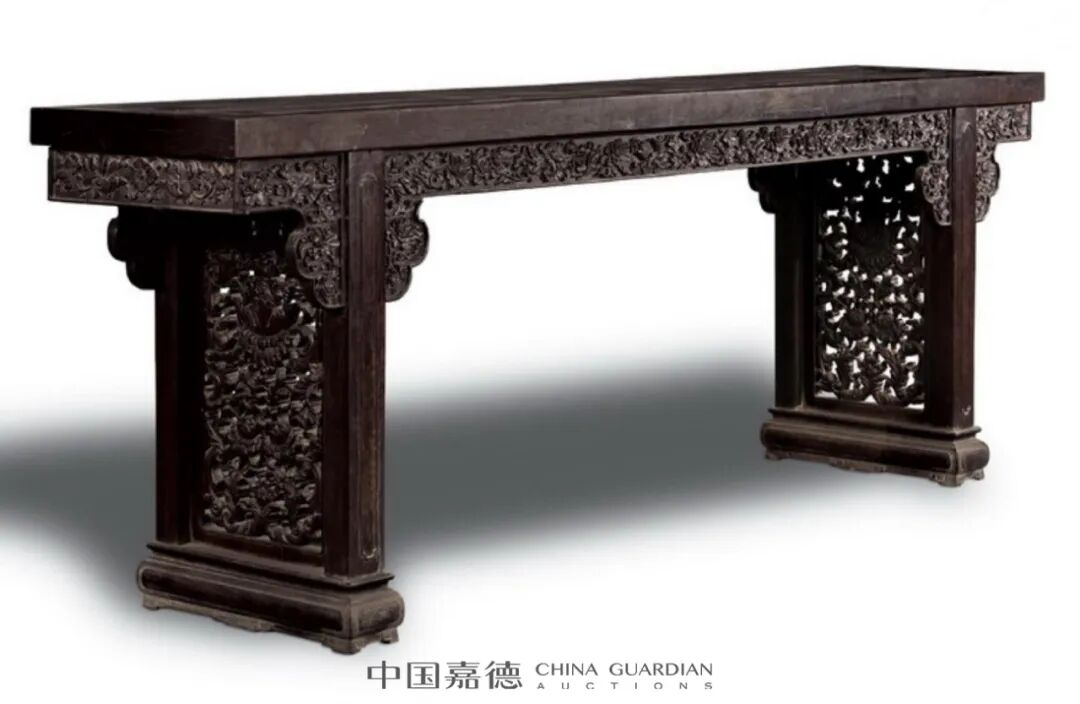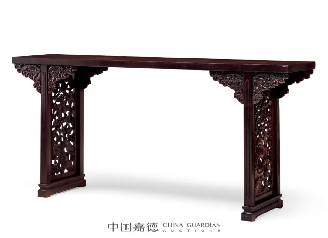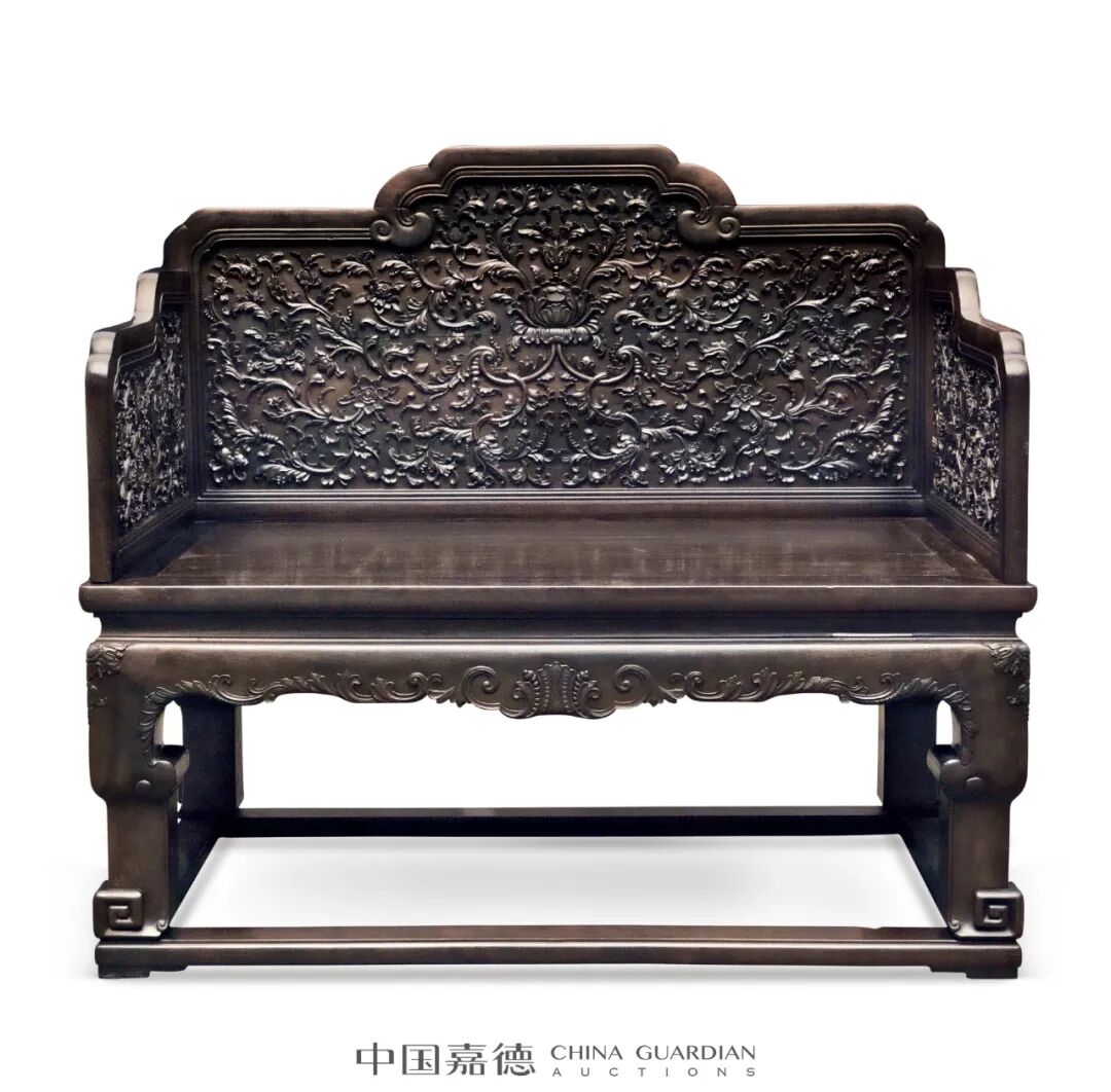 中国嘉德2017秋季拍卖会紫檀木木质坚硬,纹理纤细浮动,尤其是它的色调深沉,显得既庄重又美观,深受清代统治者喜欢。清康熙、雍正期间仅制作了少量紫檀家具,到乾隆十年 (1745)左右,乾隆开始酷爱雕刻繁缛的紫檀家具,几乎配齐了皇宫、行宫、别署、园林所需的全部家具,从而引领了清中期上层社会家具新的发展方向。嘉庆时期也只有少量的紫檀家具制造,而嘉庆之后,造办处基本上不再制作新的家具。道光时期因八国联军掠夺,紫檀家具几乎已难觅踪迹。清末虽又制作了一批新的紫檀家具,但远不及乾隆时期的精美繁华,这也是清乾隆紫檀家具价格昂贵的原因之一。清乾隆 紫檀雕西番莲“庆寿”纹宝座