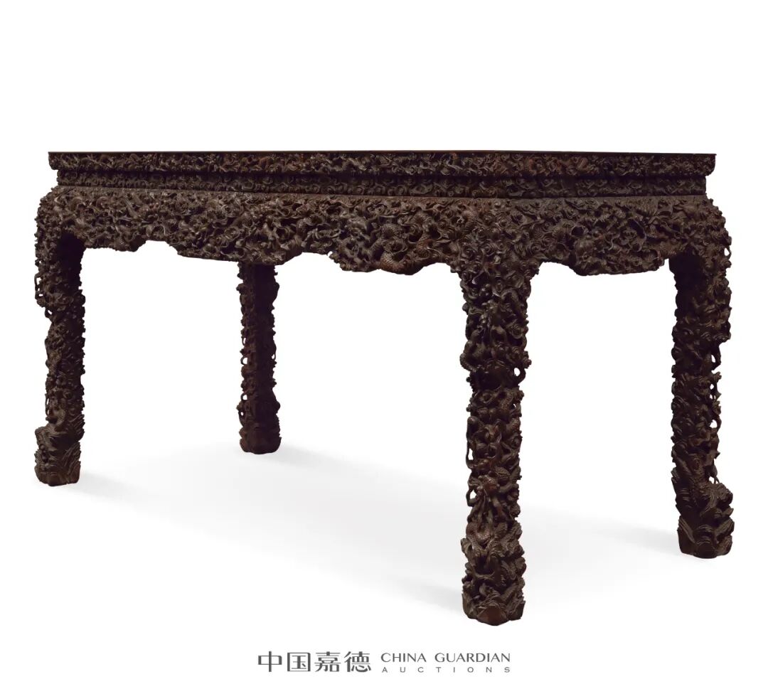 中国嘉德2018秋季拍卖会在雕饰的图案上多见如龙纹、蕉叶纹及由海水江崖、祥云、仙鹤和楼阁构成的仙境等中国传统纹样;二是西式洛可可风格的西番莲纹、卷草纹、贝壳饰等装饰纹样。亦有中西结合的纹样,也就是西番莲纹传与中国的吉祥题材,如蝙蝠、云龙等相融合的纹样。中国嘉德联系方式(滑动查阅)