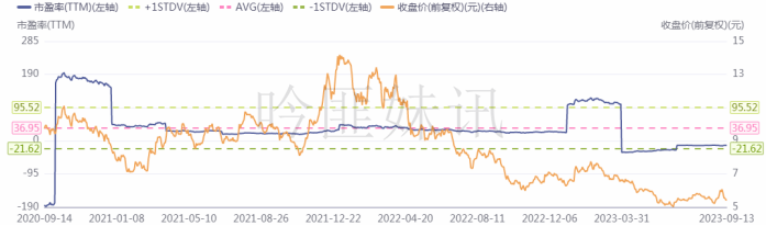 (数据来源:CHOICE)中信证券股份有限公司张家港人民中路证券营业部为张家港产业资本投资有限公司大宗交易席位。6.估值(市盈率TTM为负,股价位于近三年历史低位)近三年股价与市盈率情况