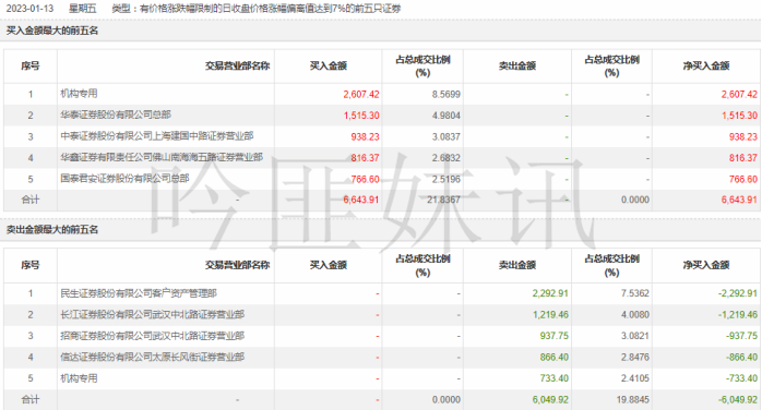 (数据来源:CHOICE)4.龙虎榜(当日上涨10.06%,收盘价7.22元)最近一期龙虎榜