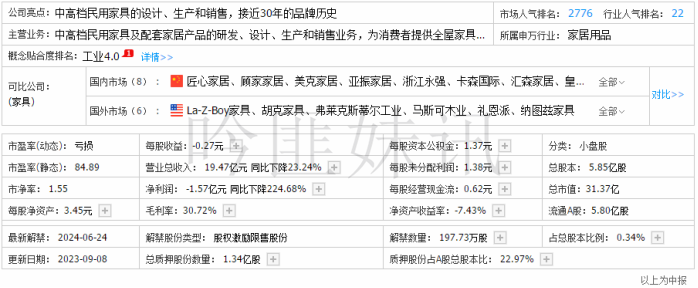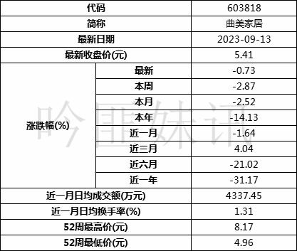 ⼀、结论A1:曲美家居主要从事家具用品业务,概念不丰富,境外收入占比70.35%。参控股子公司47家,其中27家位于境外。2023年中报看,营收下滑,利润亏损,库存下降,资产负债率不低。流通股占比991.6%,限售为股权激励限售。近两年大宗机构席位买入频繁。市盈率TTM为负,股价位于近三年历史低位。机构下调2023年盈利预期。实控人存在质押,近一年存在实控人增持。商誉10.34亿元,占比净资产47.77%。本次定增8亿元,参与门槛不高,项目主要为河南曲美家居产业二期项目、Ekornes挪威工厂产能升级建设项目。综合来看,业绩短期承压明显,二级关注拐点做布局,定增关注折扣率优势。A2:22年公司营业收入为48.53亿元,同比下滑4.34%,净利润为0.37亿元,同比下滑80.73%;23H1营业收入为19.47亿元,同比下滑23.26%,净利润为亏损1.61亿元,去年同期为1.26亿元。公司主要从事中高档民用家具及配套家居产品的研发、设计、生产和销售。本次定增主要用于河南曲美家居产业二期项目、Ekornesn挪威工厂升级以及补充流动资金,短期内对业绩无明显提升。当前房地产行业较弱,家居板块尚未有明显增长,未来随着经济的复苏,或有一定改善。公司当前股价处于历史低位,二级市场关注公司业绩拐点以及板块情况,当前位置八折定增有价格优势。⼆、公司概况1.公司简介曲美家居集团股份有限公司成立于1993年,公司主要从事中高档民用家具及配套家居产品的研发、设计、生产和销售业务,为消费者提供全屋家具和家居用品解决方案。公司秉承“设计创造生活”的理念,让家居产品成为传达“简约、时尚、现代”的文化载体。曲美是行业内少数具备全品类家具产品研发、设计和生产能力的品牌家居企业。公司的家具产品以生活美学、健康环保、品质出众为核心竞争优势,产品线涵盖成品家具、定制家具、软装饰品等各类家居产品。独创的生活馆模式融合了曲美对生活美学和生活方式的理解,将曲美全线产品、全屋设计服务和新零售模式进行有机结合,为客户量身定制全屋家居空间和生活方式,满足消费者一站式的家具和家居用品购物需求。