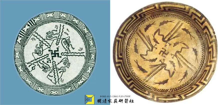 如河姆渡文化(距今约7000年)中的“卍”字符号,实际上是以一种组合方式出现的。这件出土于河姆渡文化第一文化层的陶豆盘底阴刻着四鸟盘环相绕的图案,其中心似为太阳,整体图形已经颇似“卍”字。