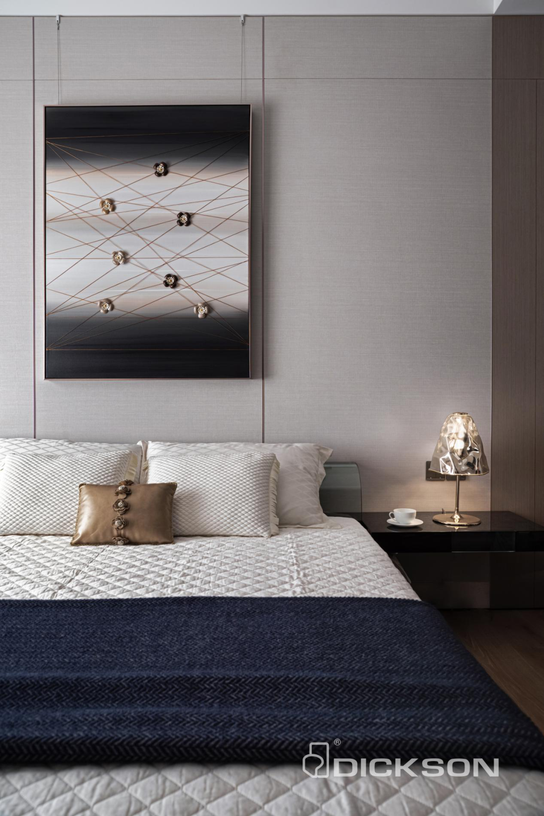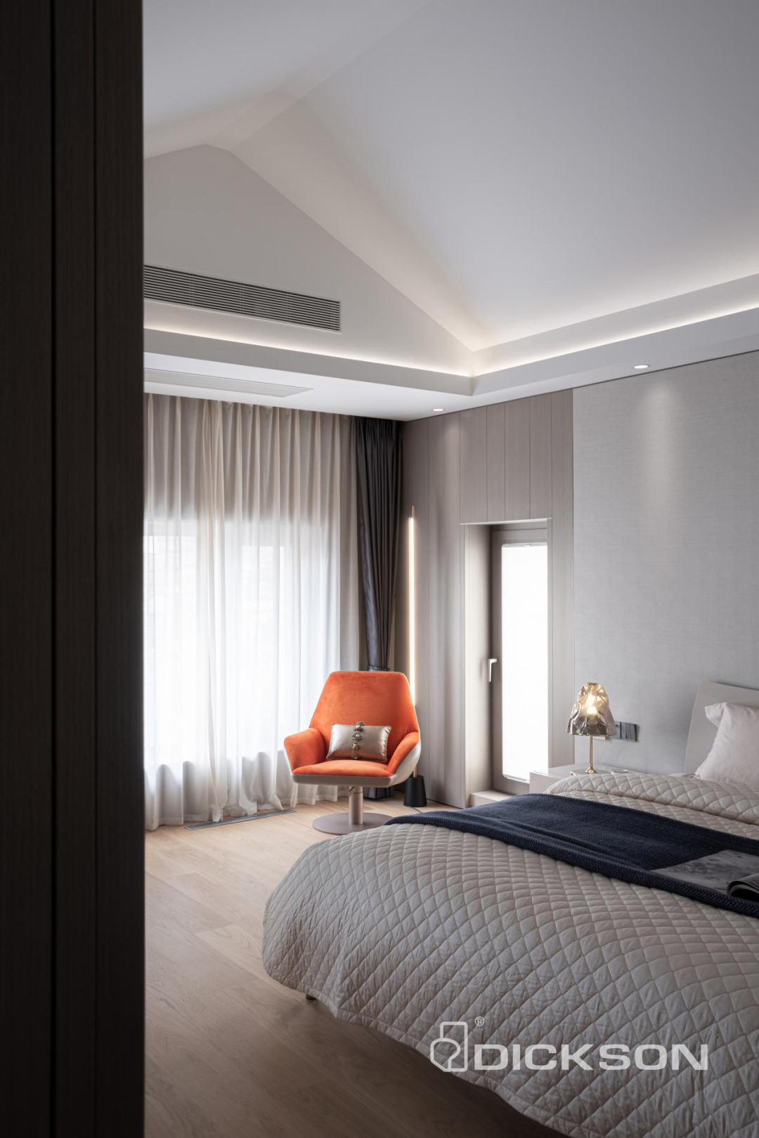 在主卧内,舒适的真皮床、高雅的矮柜、专为女士设计的多动能梳妆台、真皮贵妃椅还有意大利进口的灯饰等,共同构建了一个高雅轻奢的空间。